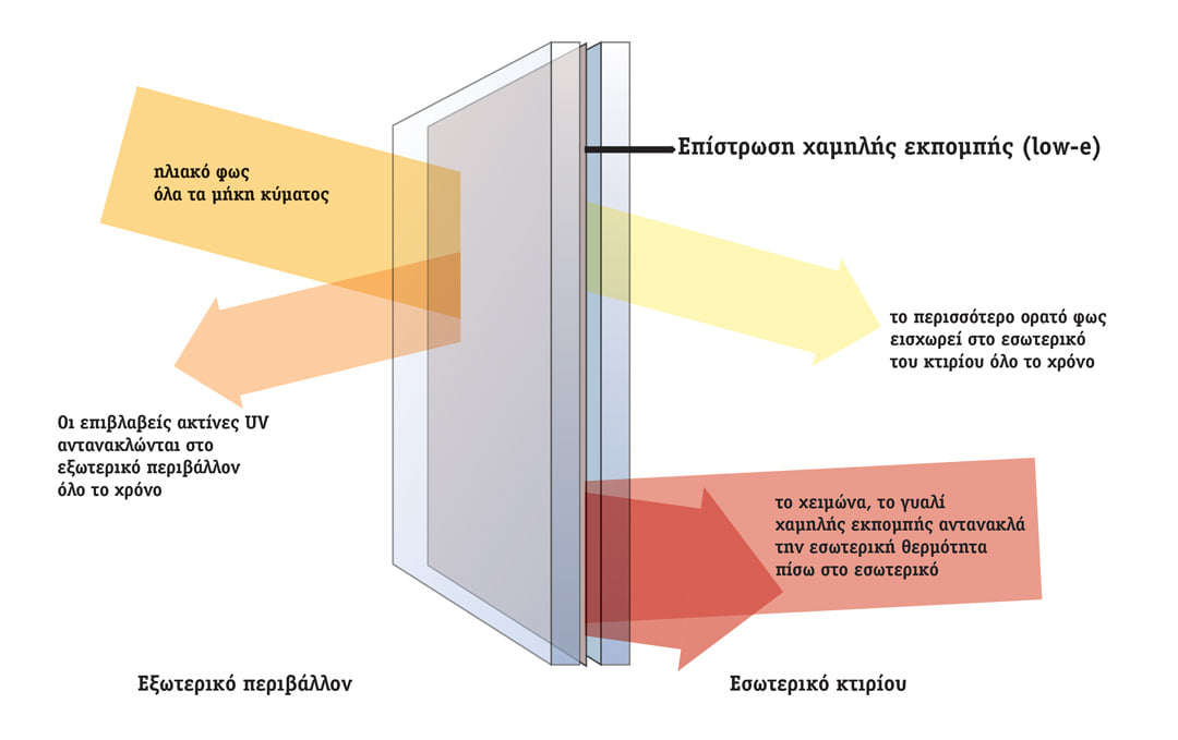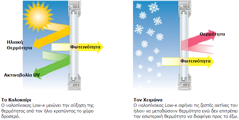Επιλέγοντας ενεργειακό υαλοπίνακα 4 εποχών μαλακής επίστρωσης, ο οποίος διαθέτει ειδικό φιλμ, επιτρέπεται το ηλιακό φως να εισχωρήσει στο κτίριο μα όχι η θερμότητα του ήλιου ως αποτέλεσμα την εξοικονόμηση ενέργειας. Δεν έχουμε απώλεια της θερμότητας των θερμαντικών μέσων (καλοριφέρ, κλιματιστικά) κατά τους χειμερινούς μήνες, το οποίο σημαίνει μεγαλύτερη εξοικονόμηση ενέργειας.
